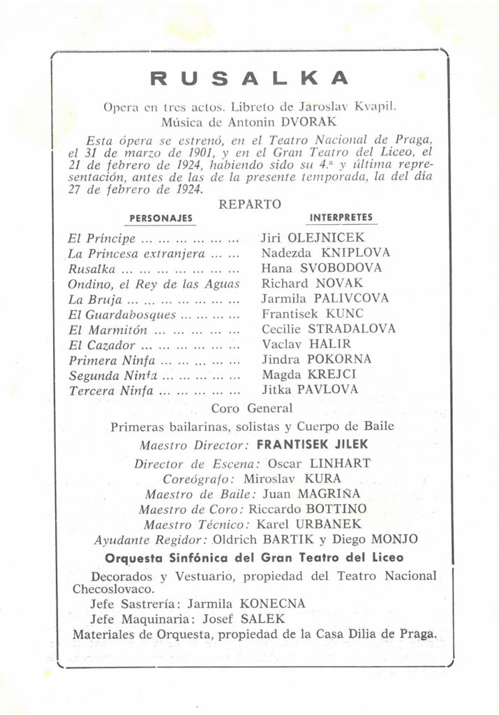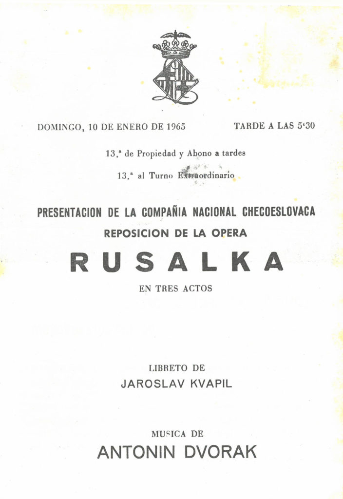 _ Programa del Liceo – 10 gener 1965 – RUSALKA – Presentació de la companyia Nacional Txecoslovaca – Mestre de ball: Juan Magriñá – Coreògraf: Miroslav Kura – Primeres ballarines solistes i cos de ball