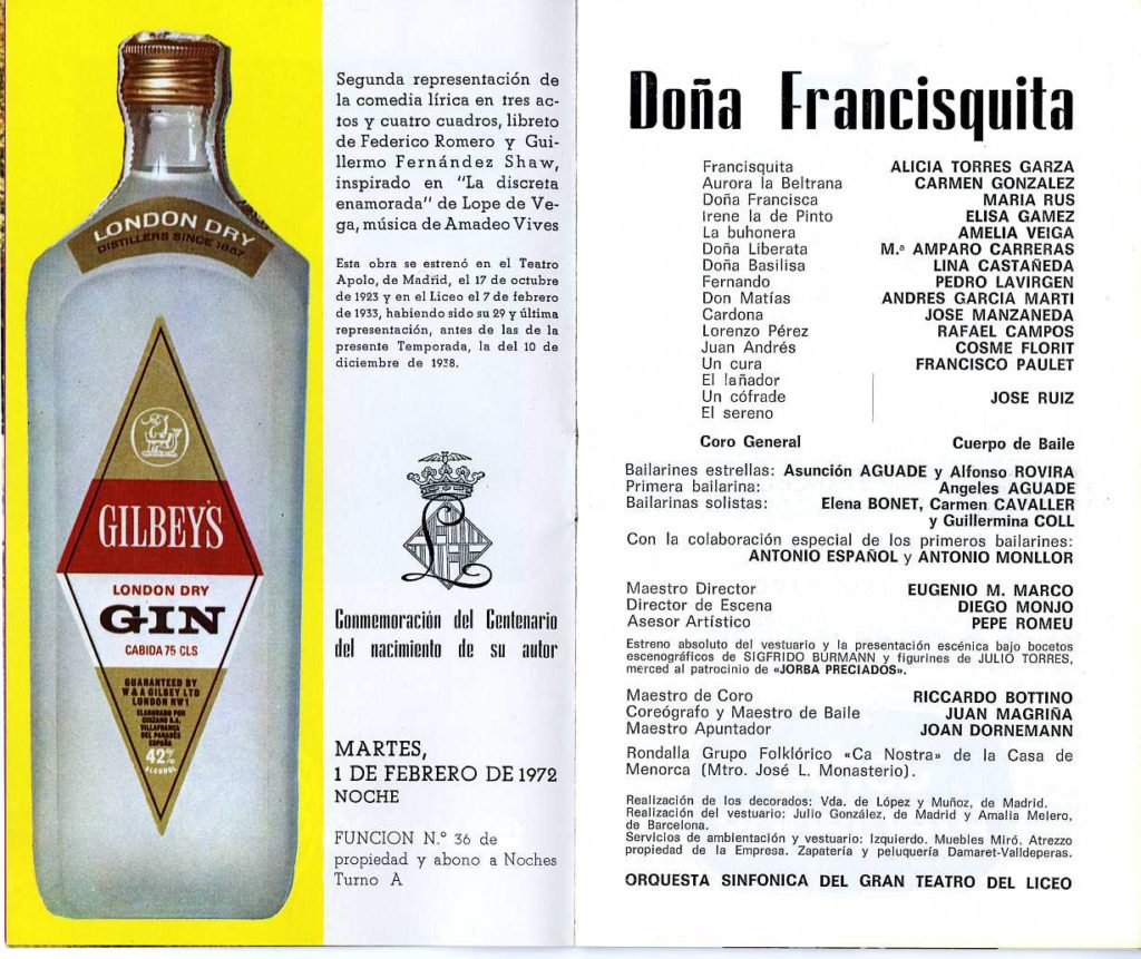 _ Programa del Liceu – 1 febrer 1972 – DOÑA FRANCISQUITA – Coreògraf i mestre de ball: Juan Magriñà – Asun. Aguadé, A. Rovira-Ang. Aguadé-Ele. Bonet, C. Cavaller, G. Coll- Col·laboració especial: Ant. Español, Ant. Monllor