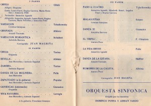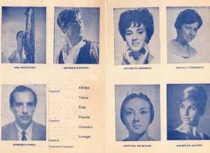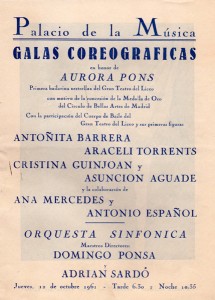 - 1961 – Palacio de la Música – Galas coreograficas – Orfeo-variacion-granada-variacion romantica-orgia-sevilla-zambra-danza de la molinera-zapateado-goyescas-viva navarra-paso a cuatro-malagueñas-danza XI-el tripili-la vida breve-danza gitana-rumores de la caleta