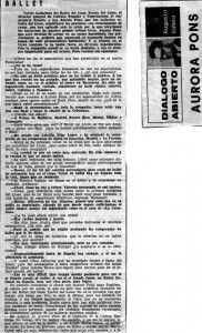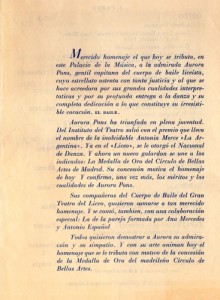 El novembre de 1954 l’intrèpid empresari liceista Joan Antoni Pamias,amb el vist-i-plau (i, per tant, la coorganització) de la Sociedad del Gran Teatro del Liceo -els propietaris del Teatre: recordar que en aquella època era un teatre totalment privat- i arran del fenòmen Renata Tebaldi&Liceu (la soprano italiana era un ídol de la casa i com a tal era acollida) instaurà un entranyable guardó molt preuat adreçat a personatges amb lligams intensos amb el coliseu de la Rambla com era el cas de la Tebaldi:la Medalla de Oro del Gran Teatro del Liceo.La nòmina de perceptors impacta (sobretot cantants lírics) i el ballet, sempre estimat per Pamias, no en fou aliè: Joan Magrinyà, Aurora Pons, Alicia Alonso i María de Ávila (aquesta darrera el 2009, durant el tímid intent de recuperació dels guardons ja en època de titularitat pública del Teatre) tingueren la seva Medalla d’Or.La de la Pons (una institució, una ‘beniamina’ del públic liceista, que l’adorava i mimava) li fou lliurada el 27 de gener de 1962 en un homenatge popular (acte adreçat també al Ballet liceista -llavors encara no Titular i identificat als programes com a ‘Cuerpo de baile’-) en el decurs de la darrera representació de l’òpera “Der Freischütz (El caçador furtiu)” de Carl Maria von Weber.Així, acabada l’òpera i a l’escenari a teló alçat se celebrà aquest acte (en el que també s’entregaren a Aurora Pons altres distincions i que incloïa el llavors tradicional i lluït ‘desfile de la compañía’, ben brillant i nodrit) i, com a cloenda, els homenatjats interpretaren la “Nit de Walpurgis”,la famosa suite de ballet de l’òpera “Faust” de Charles Gounod. – Jordi Pujal – Instagram:-art.1–art.2