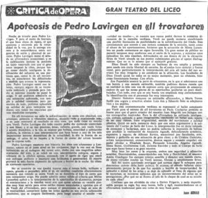 Per a aquesta commemoració verdiana es va representar el ballet compost per Verdi per a l’estrena de “Il Trovatore” a París. Qualsevol pretext és bo perquè el geni creador del mestre Joan Magriñá ens afalagui amb les seves coreografies inspirades. Per a la del “Trobador” ha utilitzat intel·ligència, cultura aplicada i gran imaginació, resultant un ballet que, a part de ser molt vistós, té originalitat, sentit del moviment i qualitat plàstica. Potser no caldria dir que amb aquests arguments i la solvència del Cos de Ball del Liceu, la interpretació va ser un èxit rotund de coreautor i ballarins, però no podria callar la impressió de bellesa que va produir la realització d’Asunción Aguadé, delicadament harmònica expressiva i segura; d’Alfons Rovira, sensacional per facultats, art, tècnica i gallardia en una actuació de gran classe; Cristina Guinjoan artista temperamental, comunicativa, tècnica segura i encant singular; sense poder oblidar a Elisabeth Bonet, Fernando Lizundia, Angeles Aguadé, Elena Bonet, Guillermina Coll, Dolors Escriche i tot el cos de ball que va saber fer honor al seu mestre.